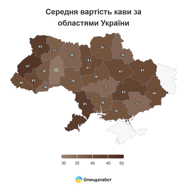 Найдешевший еспресо можна знайти на Хмельниччині – лише 33 гривні. При тому, що за годину ціна зросла на 18%. За 35 гривень можна випити еспресо в Запорізькій та Кіровоградській областях.